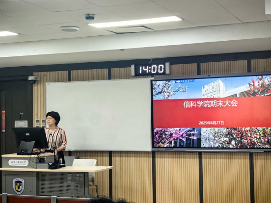6月27日下午,2025年春季学期期末大会在国际大厦409教室召开,党总支副书记刘玉华和辅导员赵韵怡出席,全体员工参加。